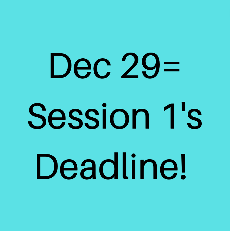 Deadline for January Classes is Dec. 29! December 27, 2021 Leave a Comment December 29 @11:59pm EST is Session 1’s deadline. Click here to register. Share this: Share on X (Opens in new window) X Share on Facebook (Opens in new window) Facebook Like Loading... Related Information